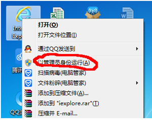 1.使用IE浏览器(或360浏览器、搜狗浏览器)打开学院网站,并在学院网站右侧导航栏选择“校园VPN”(WIN7和WIN8系统用户首次登录SSLVPN时,直接右击IE或360浏览器、搜狗浏览器等图标,选择“以管理员身份运行”,如下图)点击进入下一页面。