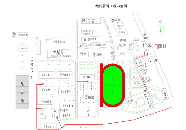 施工范围:1号大门至2号食堂的主干道、学生公寓D幢西侧道路、沿河绿化带等。见附图。