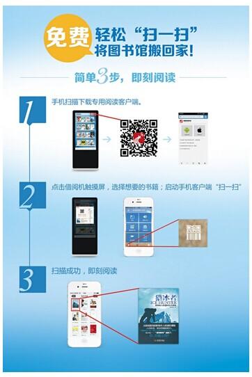 2、下载阅读:读者第一次扫描二维码下载并安装超星移动图书馆客户端后,只需在电子书借阅机屏幕上选择心仪图书,扫描图书封面二维码,便可将该书下载至手机等移动终端设备,免费体验高清电子阅读。