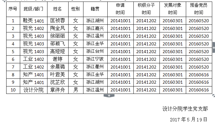 经设计分院学生党支部研究,拟将匡祯蓉等9位同志转为中共正式党员,现将其基本情况予以公示。在公示期内,欢迎广大党员、干部、群众通过信函、电话或直接到党支部或上级党委部门反映公示对象在预备期间思想品质、现实表现、廉洁自律等方面的情况。