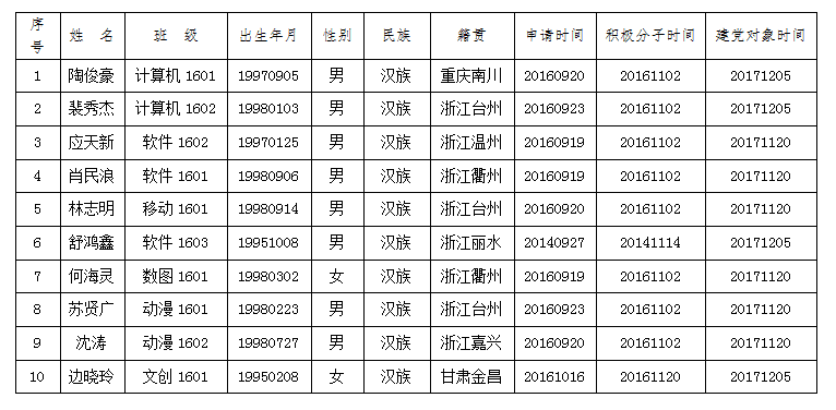 根据本人申请、组织培养,经研究,拟吸收陶俊豪等10名同志为中共预备党员,现将其有关情况予以公示。在公示期限内,欢迎广大党内、外群众通过信函、电话或直接反映等方式予以监督,以个人名义信函反映问题,提倡署真名实姓。