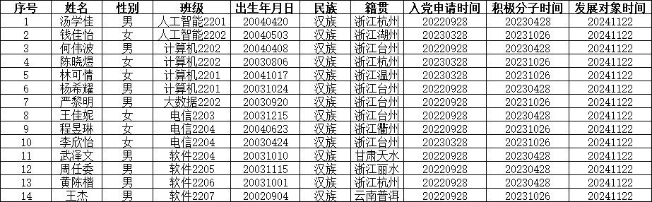 根据本人申请、组织培养,经人工智能学院学生党支部研究,拟吸收汤学佳等十四名同志为中共预备党员,现将有关情况予以公示。在公示期限内,欢迎广大党内、外群众通过信函、电话或直接反映等方式予以监督,以个人名义信函反映问题提倡署真实姓名。