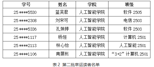 经统计,人工智能学院入馆教育完成率在各分院中最高。为鼓励新生积极参与入馆教育,本次第二批幸运读者从该学院完成学习的新生中随机抽取产生,共 6 名,具体名单如下(见表 2)。