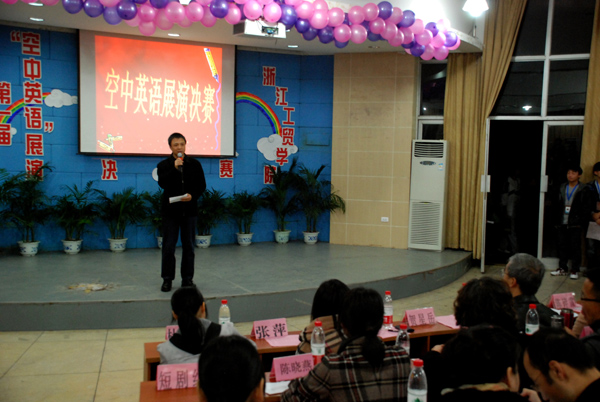 12月5日晚,我院第一届大学生“空中英语”展演活动决赛在学院阶梯大教室举行,活动由人文系、学生处及团委联合主办,学生社团联合会承办,英语俱乐部及人文系法语专业学生会协办。来自我院各分院系及学生社团的11支代表队在决赛的舞台上激情飞扬、才华四溢,上演了一场丰盛的视听盛宴。同学们在舞台上语言流畅、表演大胆、配合默契、创意新颖,充分展现了工贸学子积极向上的英语学习热情以及“空中英语教室”网络学习平台的非凡魅力,引得台下评委及师生观众们的连连叫好。