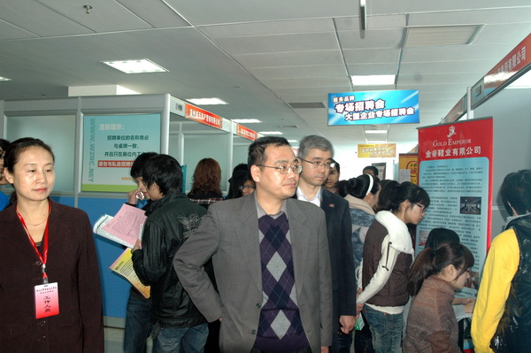 12月5日,浙江省2011届高校毕业生就业高职工贸类专场招聘暨浙江工贸职业技术学院2011届毕业生招聘会在温州市人才大厦人才市场成功举行。此次招聘会由浙江省教育厅主办,浙江工贸职业技术学院承办,温州市人才开发服务中心协办。此次招聘会吸引了来自省内外近450家用人单位,涵盖了市场营销、经营管理、广告、技工、人事行政、财务、计算机、文职人员、设计、机电、模具、电子信息等专业门类,既有一些国有大型企业(集团),也有许多处于成长中的中小企业。招聘会为大学生提供了将近13000多个岗位,岗位涉及面广、数量多,给广大求职学生提供了广阔的择业空间。