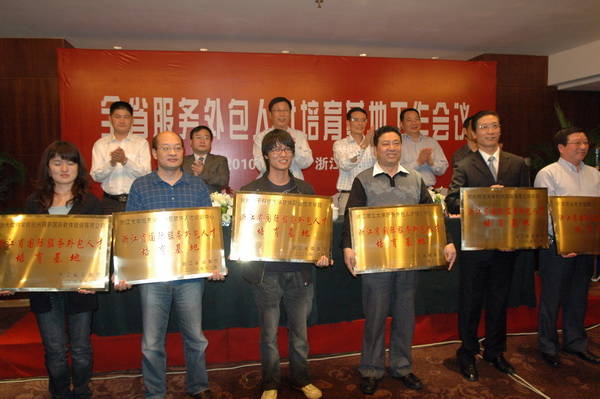 省商务厅、教育厅、市外经贸局和教育局等部门领导为18家省级服务外包人才培育基地授牌。杭州师范大学国际服务工程学院、宁波服务外包学院(宁波职业技术学院)、金华市职业技术学院、浙江工业大学计算机学院等4家院校作了“服务外包人才培育”典型性发言。针对服务外包人才培养的校企合作和课程开发,与会代表就如何充分利用自身的资源和优势,积极开展服务外包人才培训,鼓励和引导更多的大中专毕业生到服务外包产业去就业和创业进行了热烈的讨论和交流。