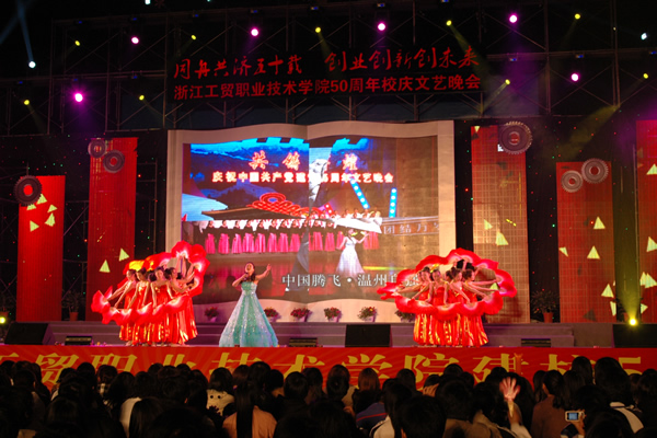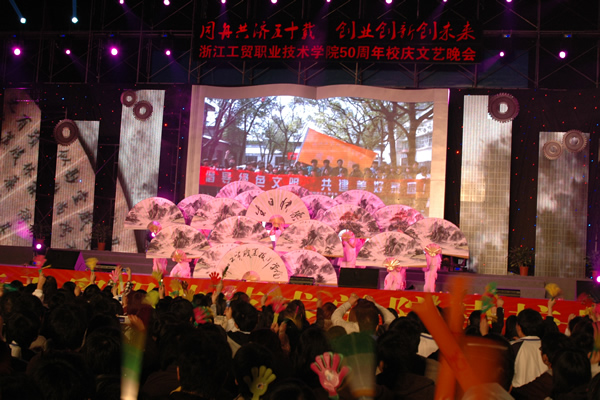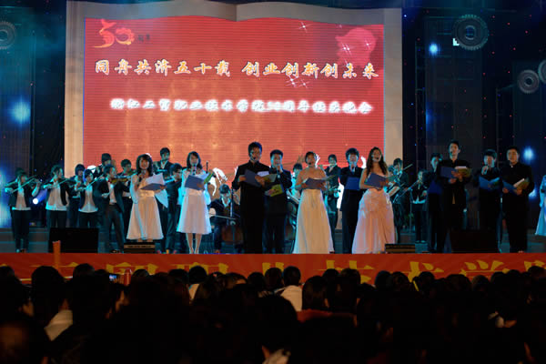 4月25日晚上19点30分,我院50周年校庆晚会在学院运动场隆重举行。出席本次晚会现场的有我院党政领导班子全体成员、厂校老前辈代表、来自全国各地的历届优秀校友代表以及在校的全体师生。晚会在一段精彩的舞龙表演下拉开序幕。本次晚会分为三大篇章:创业之路、春暖工贸、壮志同歌。在第一篇章中,我院党委书记、院长何向荣教授回顾了我院的发展历程以及今后发展方向,并对一直以来关心和支持我院发展的各级领导和全体师生表示了衷心的感谢。之后厂校老前辈浙江省冶金局原局长叶一青、浙江冶金技校原常务副校长包圣豪等也对我院近年来取得的巨大进步做了充分肯定,并希望我院继续继承优良传统,勇于开拓创新,努力朝建设教育服务型高校迈进。整场晚会恢宏大气、灯光绚丽、形式多样、内容丰富,无论是歌舞戏曲表演,还是诗歌朗诵、小品等都让现场观众领略到工贸学院优良校园文化的魅力。晚会在现场观众热烈的掌声中圆满结束。