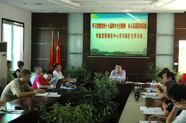 近日,学院党委举行以“学习贯彻党的十七届四中全会精神 办人民满意高校”为主题的党委理论学习中心组扩大学习会。在提前通知自学的基础上,中心组成员结合院情,就如何加强党内民主与反腐制度建设、如何推进教育改革与师生思政创新工作、如何服务杭钢与区域社会经济的转型升级三方面议题进行了集中学习。会议同时对学院学习贯彻党的十七届四中全会精神进行了部署,各系(部)书记、主任及有关职能部门的负责人列席中心组学习会。