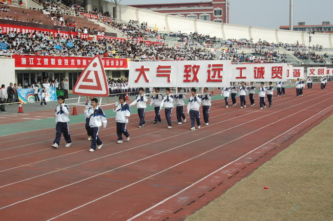 浙江工贸职业技术学院2009年运动会10月31日在温州市体育中心隆重举行,开幕式上,党委书记、院长何向荣、校院领导、各系部负责人出席了开幕式。我院9个系部的运动代表队在国旗、彩旗和校训的引领下精神抖擞的依次进入运动场,展现出工贸人良好的精神风貌。