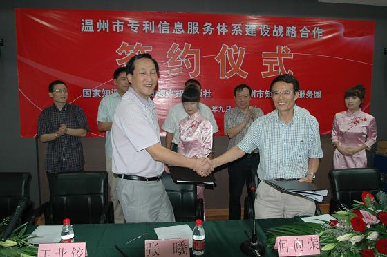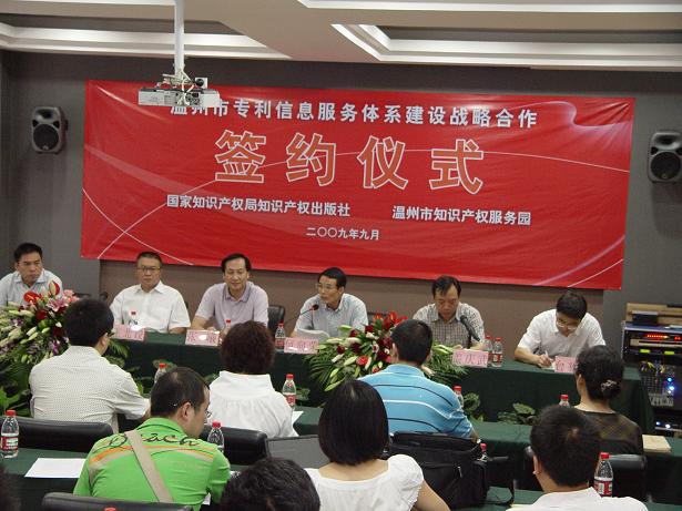 温州市知识产权服务园与知识产权出版社战略合作签字仪式2009年9月10日在温州市知识产权服务园会议室举行。此次双方合作包括:建设公益性专利信息服务平台、建设专利信息专题数据库、专利数据加工、为企业定制性开发专利信息管理系统和专利预警系统、为社会公众提供专利分析咨询分析服务等,同时并在人才培训、教材出版、品牌建设等方面达成合作协议。本次合作对于引导企业成为知识产权创造和运用的主体、增强温州企业市场竞争力,对温州市知识产权发展具有重大意义,同时这也标志着温州市知识产权服务园建设进入到新的发展阶段。