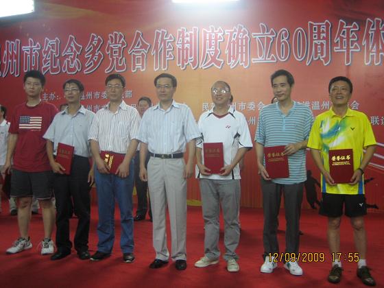 近日,在温州市委统战部主办的纪念多党合作制度确立60周年体育运动会中,我院教师李连弟代表九三学社在中国象棋项目比赛中荣获第三名。市委常委、副市长、统战部长陈作荣亲临颁奖。