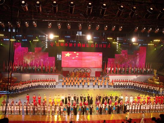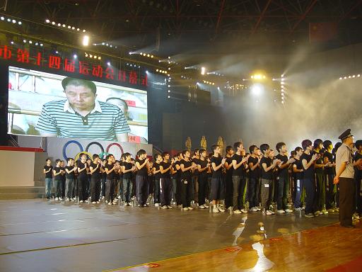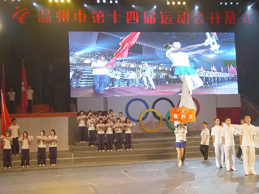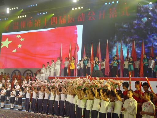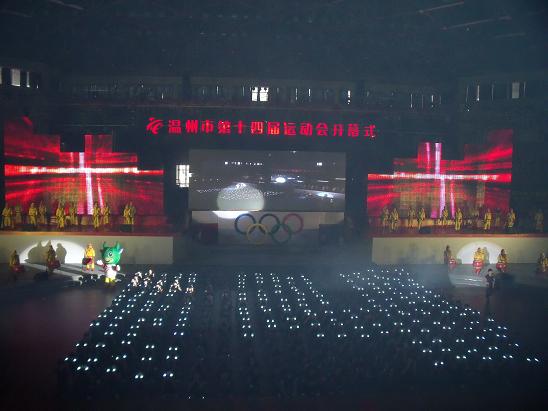2009年9月16日晚19点30分,温州市第十四届运动会开幕式在温州市体育中心体育馆隆重开幕。本次开幕式隆重热烈,场面宏大,我院应市有关部门的邀请与委托,组织了500名学生编成彩旗队、鲜花队、导牌队等参加了开幕式的演出。在序幕“奥运之光”中,300名工贸学子布阵会场中央,用手电筒打造出引人入胜的场面。六百颗闪烁的珠光在音乐的伴奏下翩翩起舞,交叉舞动、分块闪现、分散成面,最后欣然跃动,牵引着观众们的心进入“入场仪式”,赢得观众连连叫好、掌声不断。