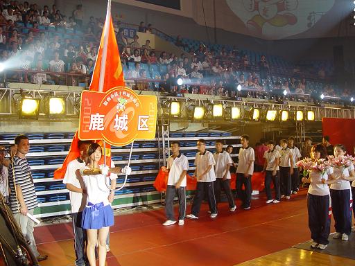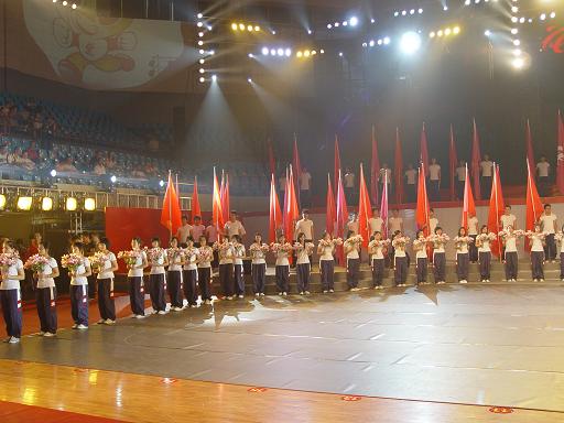 紧随国旗与市运会会旗仪仗队的一百四十名工贸学子组成了旗队与鲜花队。鲜艳的红旗与粉红的会旗在会场上随风飘扬,让人感受气势宏大,八十名工贸女生组成的鲜花队,欢迎市领导、运动员与观众的到来,用甜美的笑脸喜庆市运会。紧接的二十二位青春靓丽的工贸引导员带领着来自温州市各县市各部门的运动员代表入场亮相,异彩纷呈,英姿闪亮。
