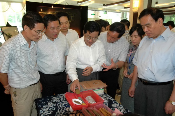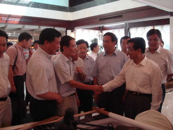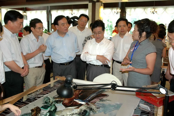 赵洪祝、吕祖善等省领导在每一幅作品面前驻足,饶有兴趣地仔细听取讲解,了解凝聚着浓厚瓯越地域文化和大众文化色彩的非物质文化遗产瑰宝的魅力。参观完毕后,省领导要求何向荣院长进行专门汇报。自2004年以来,在政府的支持下,学院以高校丰富的产学研资源为基础,大力推动瓯绣瓯塑等传统工艺美术在创作选题、工艺技法、表现形式、人才培养、产业运作模式等各个方面的创新探索,不仅创作了《国韵祥和》(瓯绣)、《绿映廊桥》(瓯塑)等精品,开设传统工艺美术专业,并且为温州传统工艺美术如何解决传承、创新、发展问题积累了丰富经验。
