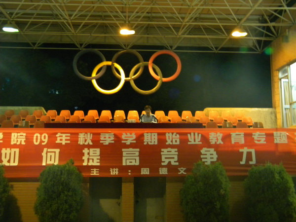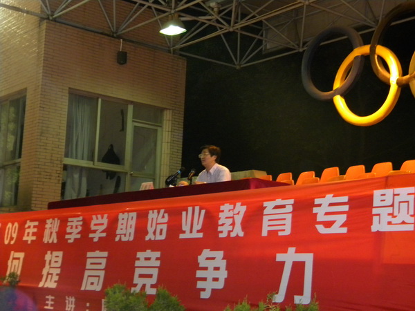 9月5日晚7点,我院运动场上灯火通明,气氛热烈,一场以“如何提高核心竞争力”为主题的始业教育专场报告会正在举行,报告会由学生处组织,著名高级经济师周德文教授主讲,学生处处长王春柳老师主持,全院2007、2008级学生参加了报告会。