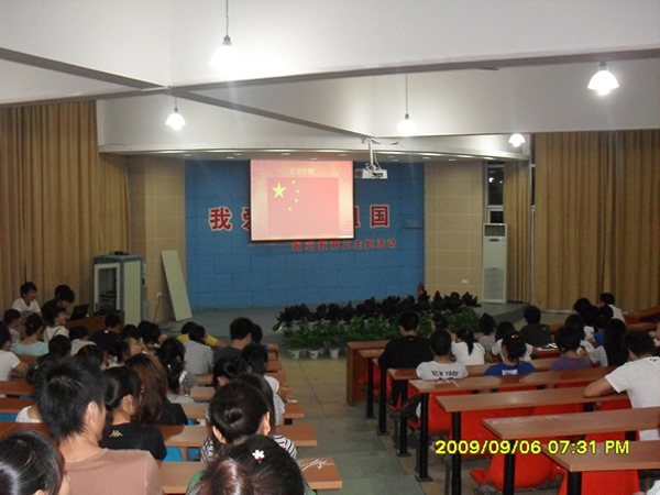 2009年9月6日晚,适逢建国60周年和学期开学,为了激发我院学生的爱国主义情怀,我校团委举办了本次以“我爱我的祖国”为主题的始业教育活动。高昂的国歌,在场所有人都满含激情,活动也以此拉开了序幕。