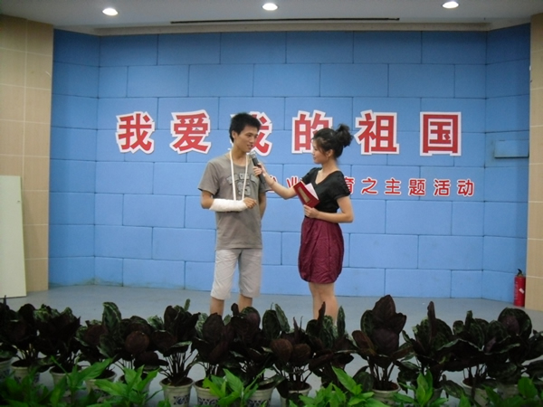 爱是一种力量,让我们忘记危险,奋勇向前。爱是一种榜样,让平凡的人身上也有夺目的闪光点。这节主题教育课的班委就是陈德虎同学。他是一名普通的学生党员。在暑期生活中,因为保护学校财产而负伤,或许这在别人看来只是小事,但是他这种不顾个人安危的行为,是一种以小见大的英勇表现,是一种爱校爱国情怀的表达。在和主持人的交谈过程中,他朴实的言语给在场的所有人一种小英雄大人物的感觉。他也因此赢得了在场所有人阵阵不歇的掌声。
