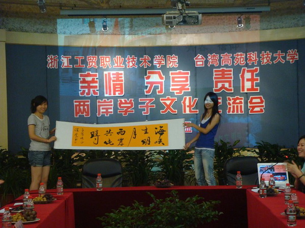 两岸师生脸上洋溢的笑脸让这次的会议充满了浓浓的亲情。我院青橄榄书法中心的同学也送上自己的祝福。亲手书写的中国书法,饱含着浓浓的文化,“海峡生明月,两岸共此时”、“腾龙震霄汉,豪杰出中华”。结束稍带正式的会议议程,两岸学子度过了一个小小的狂欢节。青年的孩子们载歌载舞,心手相连,彼此拥抱,此刻分别,眼泪交织着欢笑。如同那首歌,月亮代表我的心,美好的夜晚,两岸的情深。
