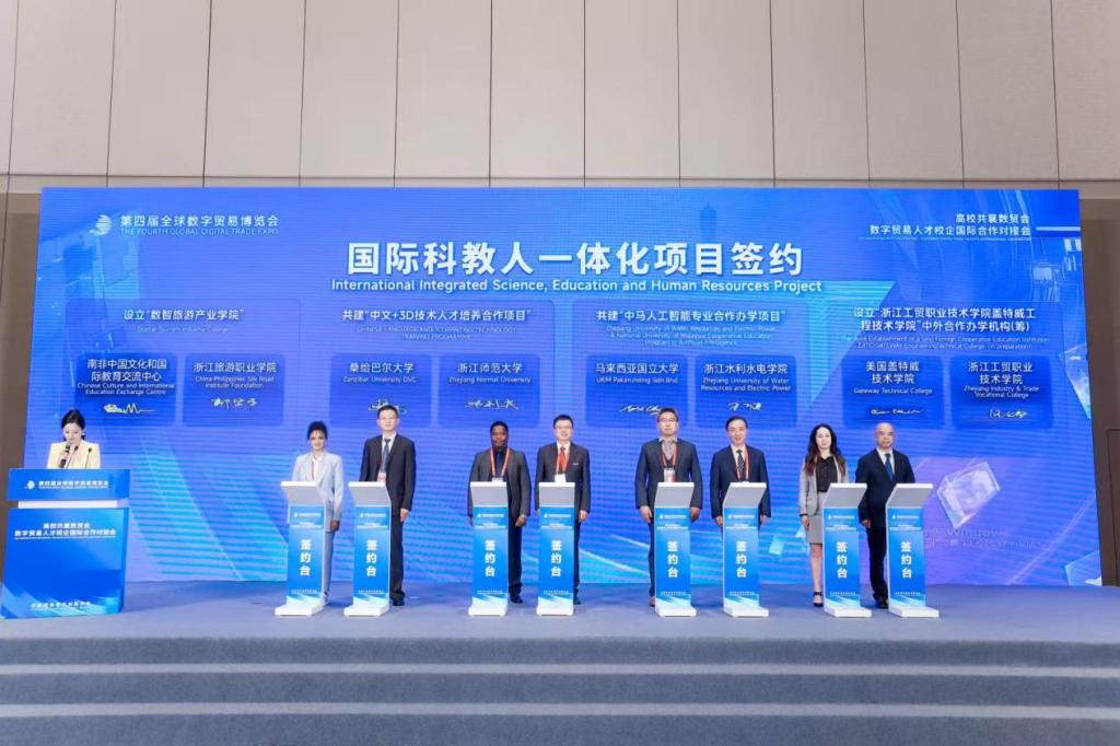 9月28日下午,由浙江省人民政府主办,浙江省商务厅、浙江省教育厅、浙江省人力资源和社会保障厅承办的“高校共襄数贸会—数字贸易人才校企国际合作对接会”在杭州大会展中心举办,副校长汪焰、美国盖特威技术学院、北卡教育联盟等一行参加会议。会上,一批高水平国际合作项目落地,成为本次活动的“亮眼成果”,学校作为签约项目之一,由汪焰副校长代表学校与美国盖特威技术学院签署共建“浙江工贸职业技术学院盖特威工程技术学院(筹)”中外合作办学机构。