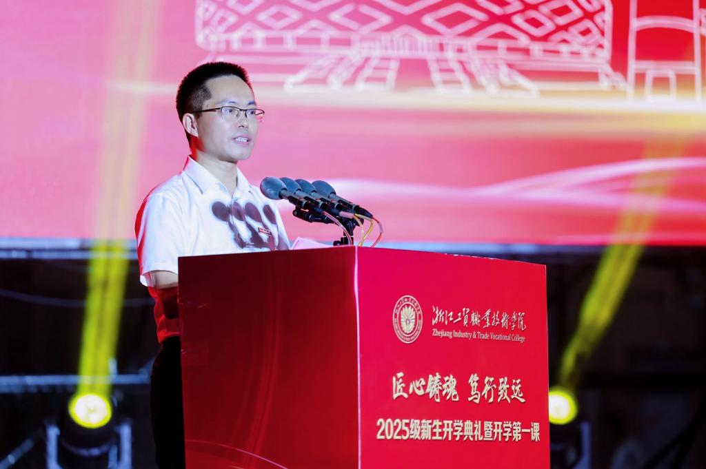 党委书记张志东以《立德树人德技并修青春许国——在新时代新征程上挺膺担当收获新进步谱写新篇章》为题为新生讲授“开学第一课”。他对新生提出四点希望:一是要爱上工贸,朝气蓬勃迈上新征程。学校必定会给同学们最优质的教育教学和成才生态,许大家一个最美好的未来。以创设好专业、好老师、好就业的“三好”条件,提供学校用心,家长安心,学生开心的“三心”服务,以及链接两个校区和社会打通的“三美”环境,呵护每一位同学的成长成才。二是要铸魂青春,挺膺担当奋斗新时代。要坚定理想信念,忠于党、忠于国家、忠于人民、忠于社会主义,把伟大抗战精神深深熔铸于实践中;全面学习贯彻习近平文化思想,增强文化自信,增强“文化的力量”;始终做政治安全的守护者、主流价值的传播者、时代使命的践行者。三是要全面发展,茁壮成长收获新进步。成长是一场不断超越自我的马拉松,进步是日积月累的必然结果。在学校求学的时光里,同学们要筑牢专业之基、拓展素养之翼、促进身心健康、提升综合素养,用全面发展铸就青春最亮丽的底色,努力成长为德智体美劳全面发展的社会主义建设者和接班人。四是要追逐梦想,奋发有为谱写新篇章。追逐梦想,首先要敢于有梦,立下青春志向;更要勇于追梦,付诸扎实行动;还必须勤于圆梦,融入时代洪流。同学们的理想追求,要在推进中国式现代化、大力发展新质生产力的时代的坐标系中实现价值的最大化,矢志技能成才、笃行技能报国。