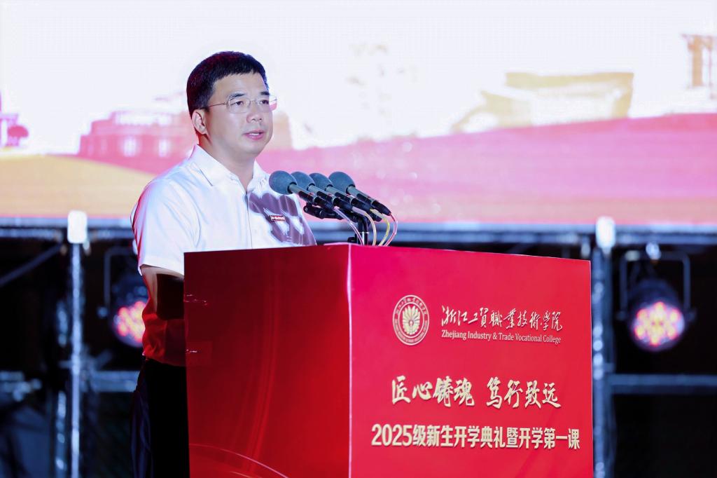 校长余闯致辞,他希望同学们在工贸学院的时间里,收获的不仅是知识和技能,更是直面未来的勇气和智慧。他向新生提出三点建议: