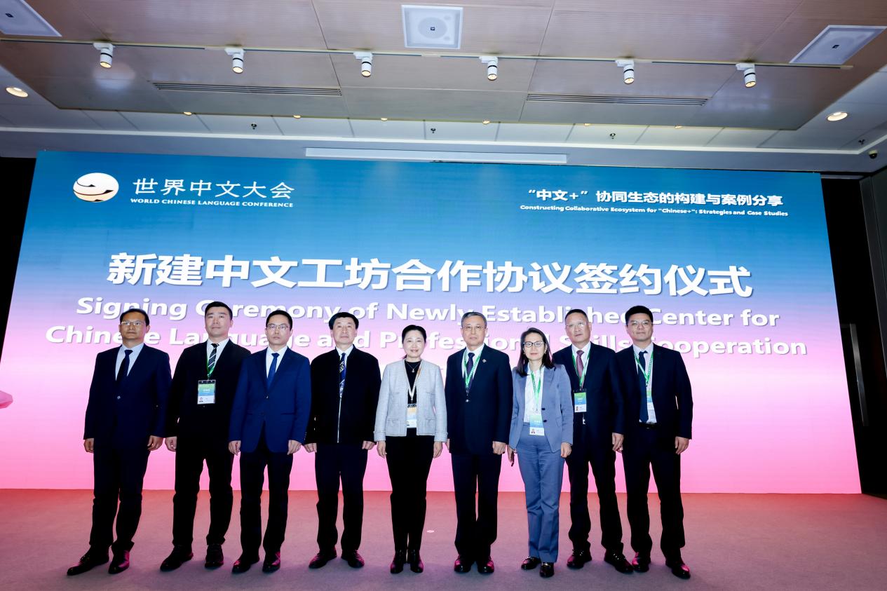 学校校长余闯与青山实业鼎森控股总经理助理何少博作为正式代表出席大会,并与教育部语合中心副主任于天琪共同签署“津巴布韦青山鼎森中文工坊”共建协议。该项目的成功入选,标志着我校在国际化办学领域取得重大突破,成为服务国际产能合作与国家战略的又一实质性成果。