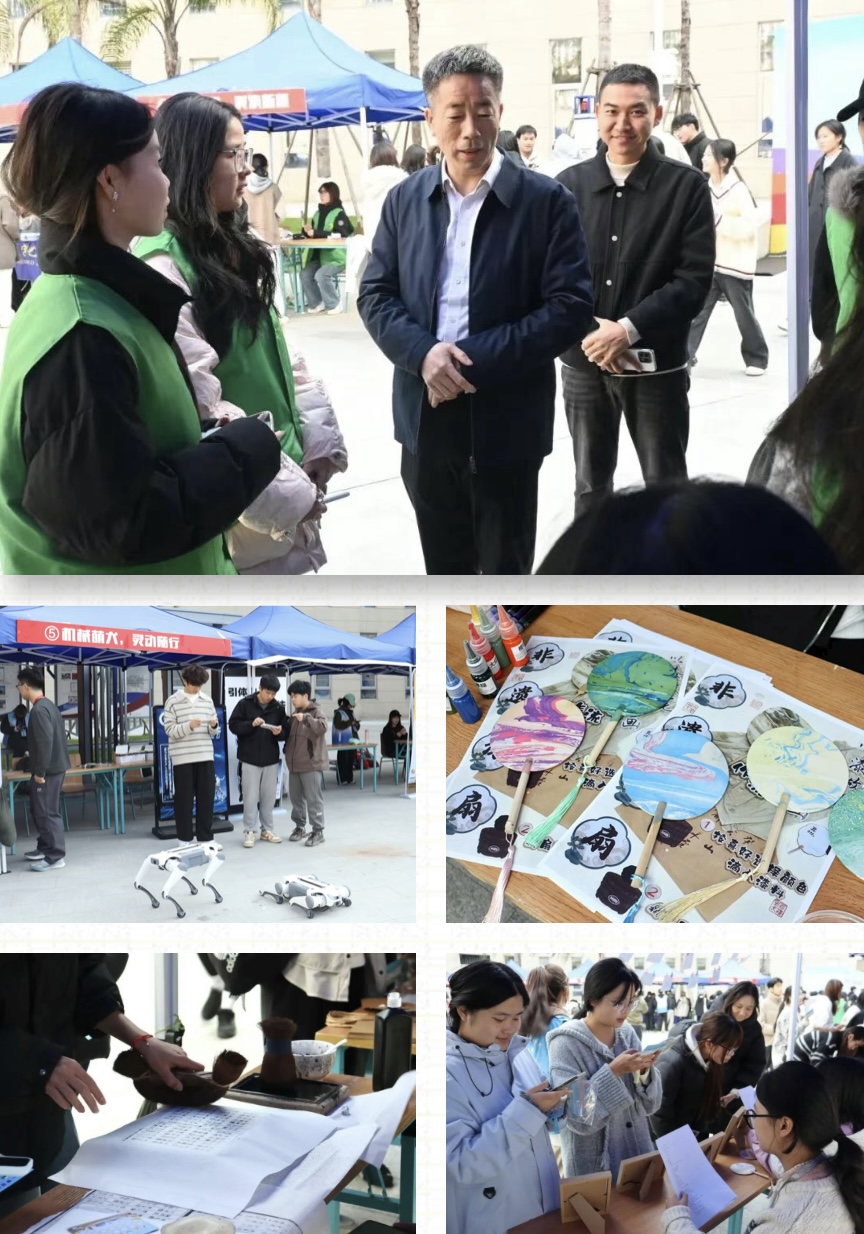 启动仪式结束后,学校领导移步广场,走进各摊位体验打卡点,与同学们亲切互动,或驻足观看3D打印、无人机等专业技能展示,或参与趣味体育体验项目,在轻松愉快的氛围中倾听学子心声,感受校园文化的活力。