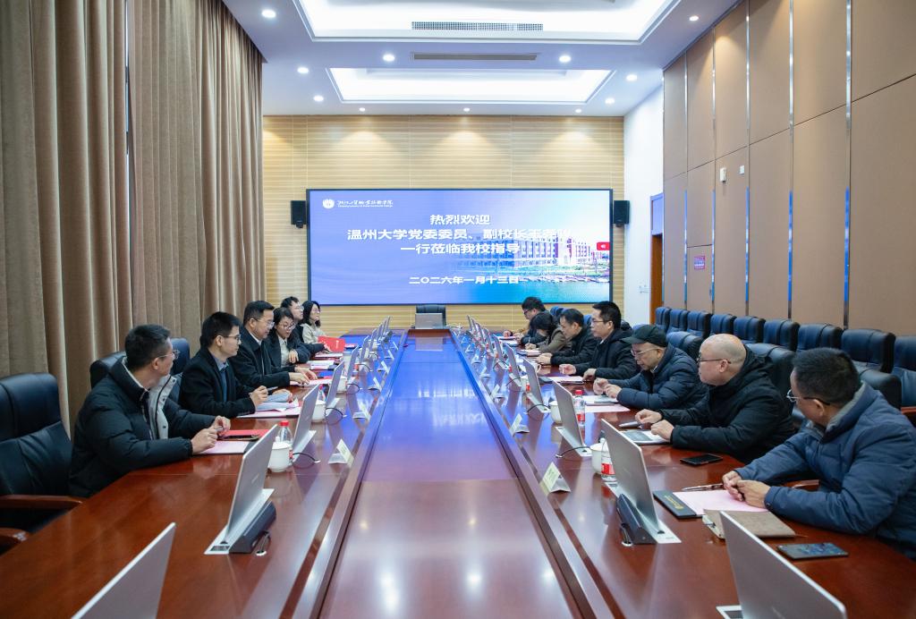 近日,温州大学党委委员、副校长王尧骏一行来学校开展专题调研,围绕合作办学、实习实训与专业建设等主题进行深入交流。我校党委书记张志东,党委副书记、校长余闯,副校长汪焰等热情接待了调研组。