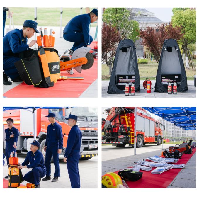 仪式前后,现场设置消防设施展示区、模拟灭火体验区,同学们有序参观消防器材、动手操作模拟灭火设备,亲身体验“提、拔、握、压”灭火操作与火场逃生要点,在实践中掌握实用安全技能。