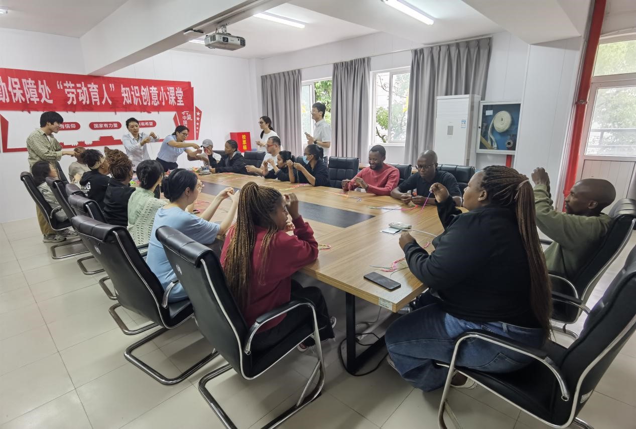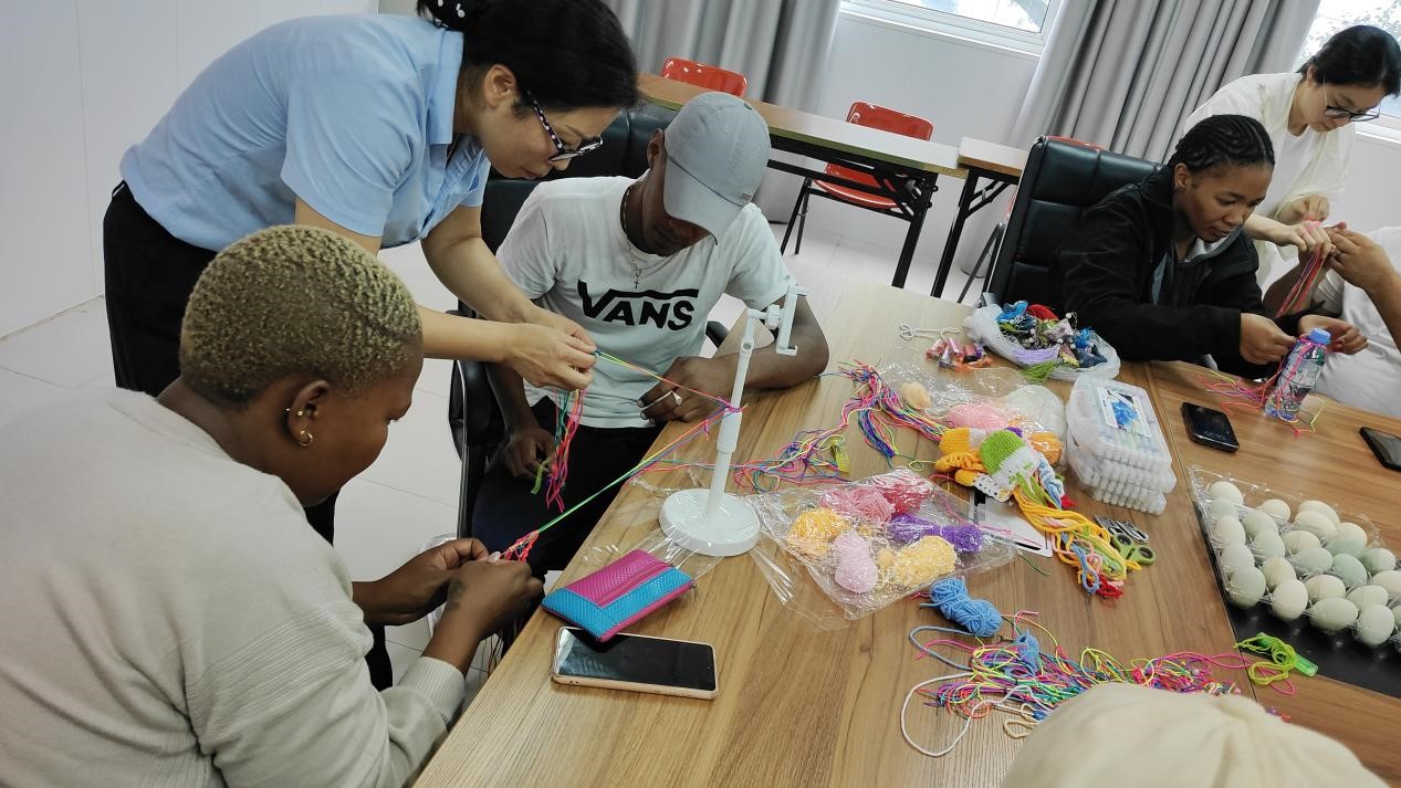 除了包粽子,活动还设置了编织蛋袋环节。志愿者们向留学生们介绍了端午挂蛋袋的习俗,寓意平安健康。五彩丝线在指尖穿梭,留学生们专注地学习编织技巧,有的编成网状,有的结成花样,再将煮熟的鸭蛋装入其中,制成独具特色的端午吉祥物。小小的蛋袋不仅承载着节日的祝福,也象征着中非学子之间紧密相连的情谊。