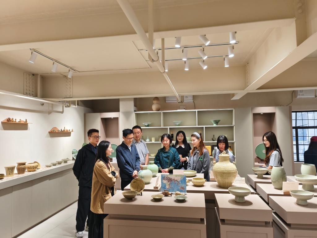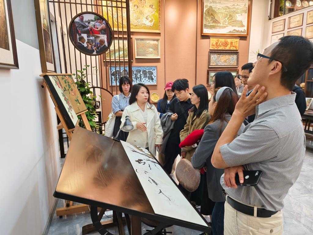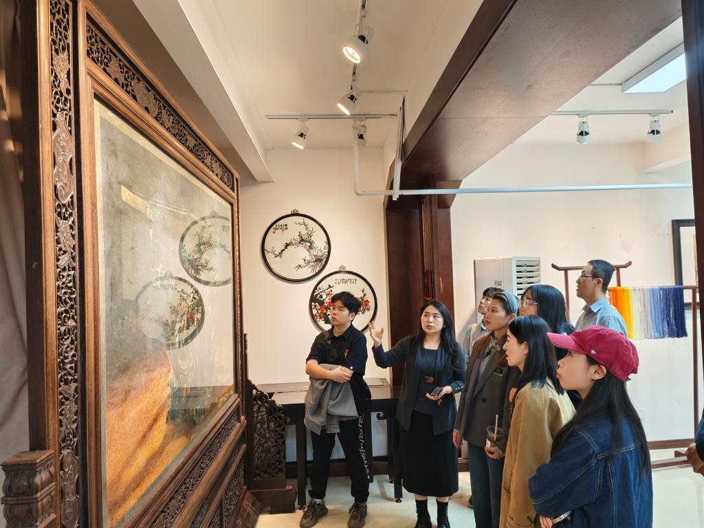 在瓯窑馆,吴少珺老师带领大家追溯瓯窑的千年历史,从釉色演变、器型设计到烧制技艺,细致讲解瓯窑工艺特色,引导大家感受传统陶瓷工艺的匠心与智慧;移步瓯绣馆,余琼老师以丝线、图样为载体,现场展示瓯绣核心技法,新师们在欣赏优秀作品的同时,领略这项画绣结合的千年艺术瑰宝;最后一站,郑央凡老师解读瓯塑“以塑代画”的艺术特点在装饰、文创等领域的应用,并结合自身艺术实践经历为新师们开设美育课堂,现场不时传来对非遗技艺的赞叹。