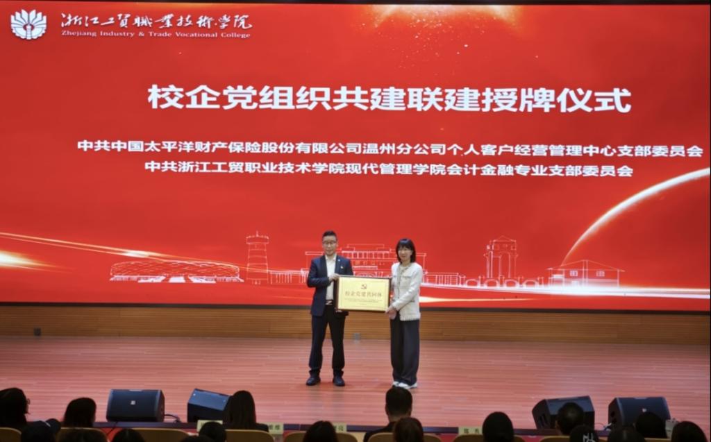 活动紧接着举行了校企党组织共建联建揭牌仪式。太平洋财产保险股份有限公司温州分公司个人客户经营管理中心支部书记张观亮和现代管理学院会计金融党支部书记郑秀共同对“校企党建共同体”揭牌,标志着双方党支部正式结对,未来将以党建为引领,深化在人才培养与业务创新等领域的协同合作。