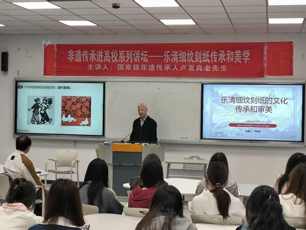 10月28日下午,“非遗传承进高校系列讲坛——乐清细纹刻纸传承和美学”在我校A312智慧教室顺利举办。国家级非遗传承人卢发良老先生担任主讲人,与设计与数字艺术学院工业设计专业师生共同探寻细纹刻纸的历史脉络与美学魅力。