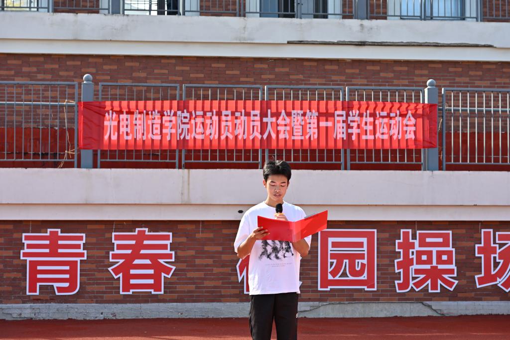 在开幕式上,陈磊老师寄语全体光电学子:体育不仅是力量与速度的比拼,更是意志的磨砺和精神的洗礼。他回顾了往年赛场上那些咬牙坚持、默契配合、相互鼓励的动人瞬间,勉励大家以“安全第一、友谊第二、比赛第三”为准则,在此次运动会中尊重规则、尊重对手,全力以赴、奋勇争先。他希望同学们将赛场上的拼搏精神延续到学习与生活中,用团结、坚韧与热爱书写属于光电学子的青春华章。