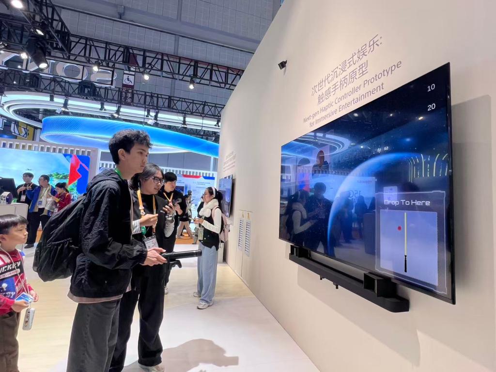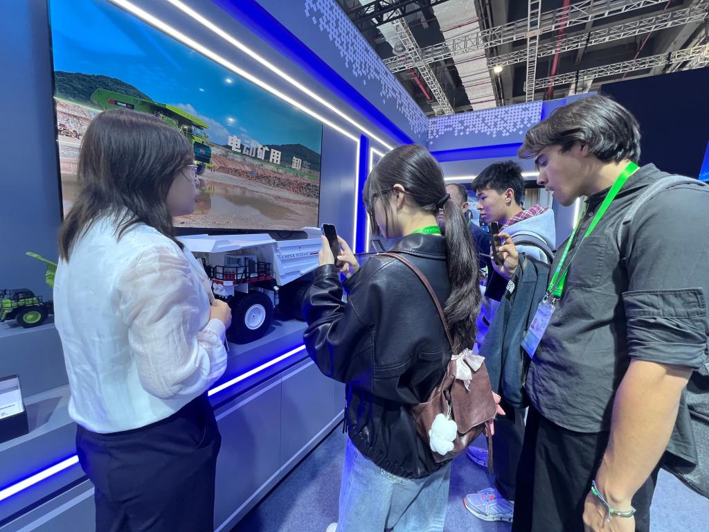 在技术装备展区,国际学生们被各种前沿科技产品深深吸引。他们首先参观了电动矿用车辆模型,了解了新能源在重型工业领域的应用;随后,他们与人形机器人进行了互动,KAUKIN ALEXANDER举着手机拍摄机器人的机械臂演示,直言“中国智能装备的精细化程度超出预期,这对我的编程学习很有启发”;在芯片技术展柜前,学生们认真听取了解说,对中国在半导体领域的创新突破表示赞叹。汽车制造展区里,学生们了解到树脂玻璃硬化涂层剂技术;在游戏科技专区,次世代触感手柄和VR电竞体验区更是让学生们兴奋不已,纷纷亲身体验科技带来的沉浸式娱乐体验。