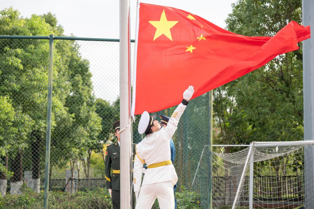 晨光映照旗帜,微风轻拂心潮,鲜艳的五星红旗在全体师生庄严注目下冉冉升起。