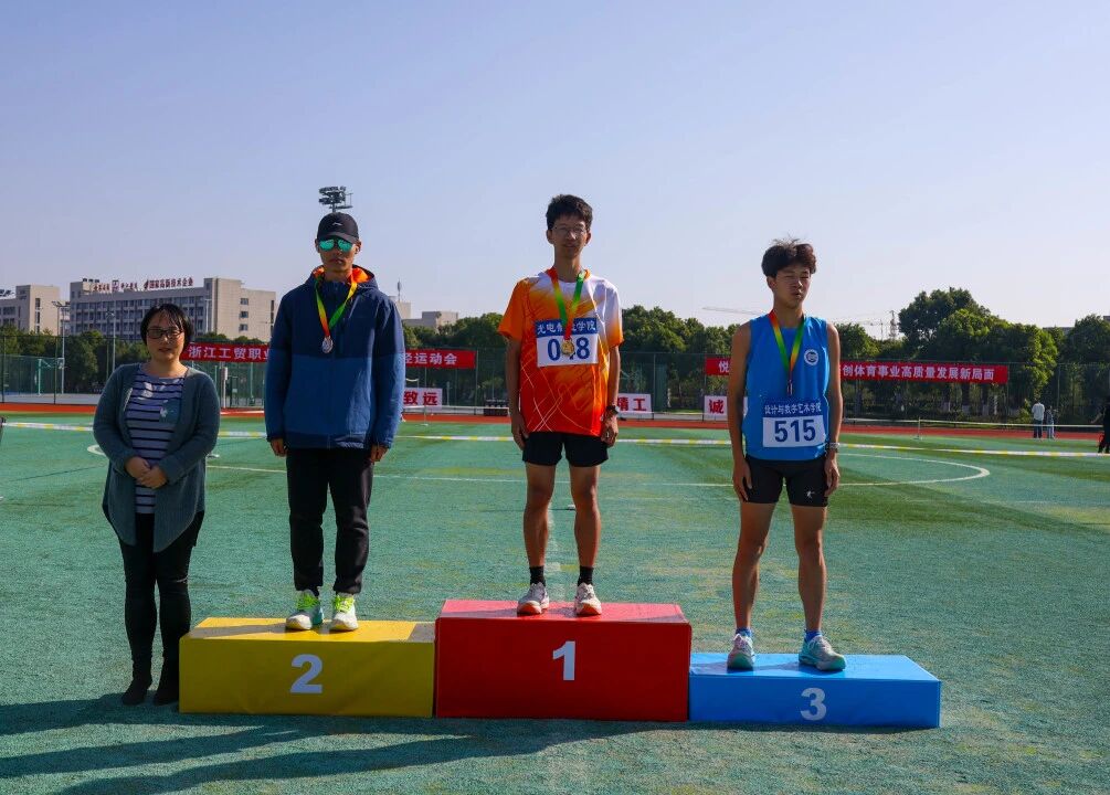操场上,颁奖仪式简洁而热烈。光电制造学院的师生围聚一处,目光热切地聚焦于中心。站在领奖台上的代表脸上洋溢着欣慰与自豪,台下的队员们昂首挺胸,眼中闪着拼搏后的光亮。