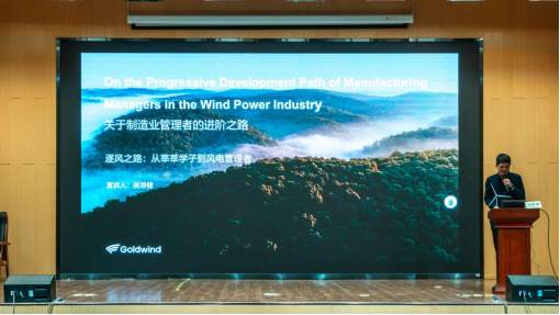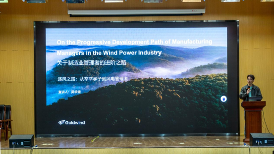 金风科技作为全球风电领域头部企业,业务覆盖6大洲47国,2024年营收达566.99亿元,累计风电装机容量超145GW,凭借7600余项全球专利与强劲技术实力,成为清洁能源产业的领军者。主讲人吴垠健以“逐风之路:从莘莘学子到风电管理者”为题,分享了自己深耕制造业的十年匠心历程。从2013年入职金风科技担任总装操作工,到质检员、区域质检主管,再到如今的温州总装厂厂长,他用一步一个脚印的成长经历,生动诠释了“敬业、专注、创新、坚守”的工匠精神内核。
