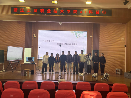 随后的实践体验环节将现场气氛推向高潮。学院带来的智能机械狗与VR虚拟现实设备成为全场瞩目的焦点。在教师和志愿者的引导和讲解下,机械狗灵活地完成行走、转身、跳跃甚至打招呼等动作,引得孩子们惊叹连连。同学们更是有幸在老师手把手的指导下,亲自通过平板电脑发送指令,体验“指挥”机械狗的乐趣,直观感受“代码驱动行为”的神奇。