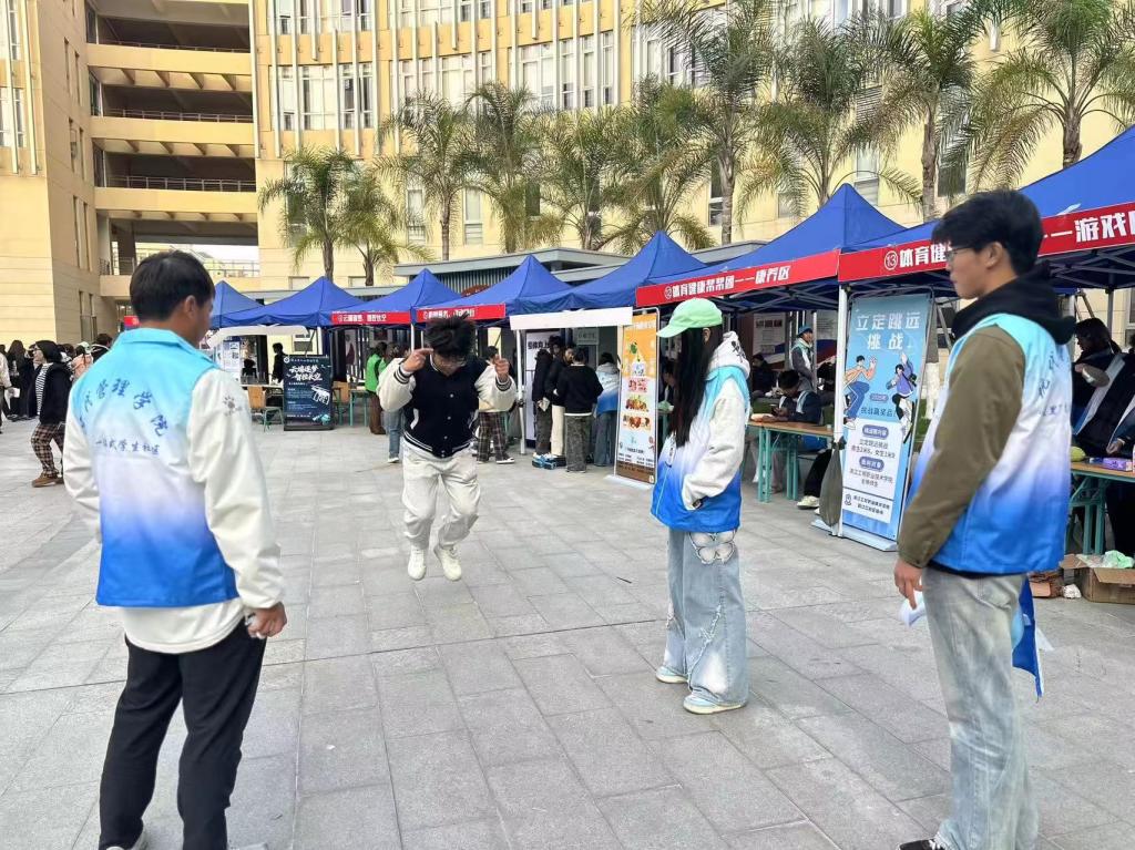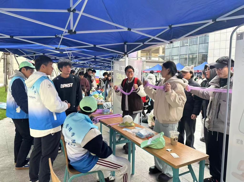 紧邻答题猜谜区的立定跳远与趣味拉伸区同样热度高涨。立定跳远区前,同学们依次排队发力,摆臂、蹬地、腾空一系列动作连贯流畅,现场不时响起加油鼓劲的欢呼声,工作人员实时记录成绩并提供专业动作指导,帮助大家掌握发力技巧、突破自身极限;趣味拉伸区里,现场设置了专业的体能测试与互动拉伸环节,工作人员为同学们进行腿部柔韧性等体能指标的专业测量,还准备了弹力带等工具,带领大家开展分组互动拉伸游戏,同学们两两配合用弹力带完成肩颈、手臂、腿部的拉伸动作,在趣味互动中学习科学的拉伸方式,有效缓解学习与运动带来的肌肉紧张。参与两项运动类活动的同学还能获得打卡印章,累计后可兑换定制小礼品,进一步点燃了大家的参与热情。