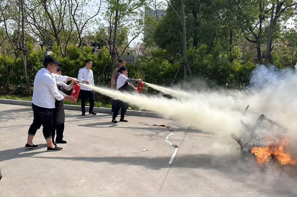 第二阶段是消防器材使用和灭火演练。学员们学习了如何迅速链连接消防水带,穿好灭火防护服、靴子、裤子,粘好尼龙搭扣,戴好头盔等主要步骤,并与队友一同完成灭火接力和水枪定点射靶等水枪灭火操作。接着,赵凯老师对灭火器的正确使用等进行了详细讲解,安保人员对灭火器材的使用进行了演示,食堂工作人员按照灭火器使用的四个标准规范“提、拔、握、压”,在模拟火灾现场,拿起灭火器,对准火源,成功将火焰逐一扑灭。通过亲身实践,食堂工作人员深刻体会到了正确使用消防器材的重要性。
