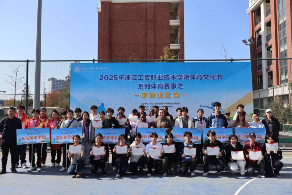 025年12月6日,浙江工贸职业技术学院体育文化节地掷球项目在瓯江口校区顺利开赛。本次赛事由浙江工贸职业技术学院体育运动委员会主办,现代管理学院公共体育教研室承办,地掷球社团协办,经过热烈的角逐,我院地掷球小队张哲启、王钟瑞、徐芹、蔡文静四人以自身丰富的经验和精湛的技艺,斩获比赛冠军,展现了我院学员拼搏进取的竞技精神和团结协作的团队素养。