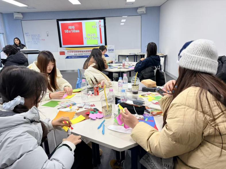 全程的研学之旅,也是一场跨文化沟通的实战演练。两天的学习内容丰富且充实:韩国语文化课上,从基础发音到日常对话,大家积极互动,在轻松愉快的氛围中提升语言能力;传统文化体验课上,同学们亲手体验韩服折纸,学习传统礼仪,深入感受韩国文化的独特魅力。