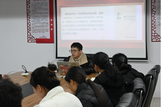 为引导学生党员深刻理解中国式现代化、坚定理想信念,2025年12月22日晚,国际商贸学院学生党支部在AB栋党员之家组织开展十二月党课学习活动。本次活动以“青春燃星火,伟业启新程”为主题,特邀人文学院朱成龙老师授课,学生党支部全体成员参加学习。