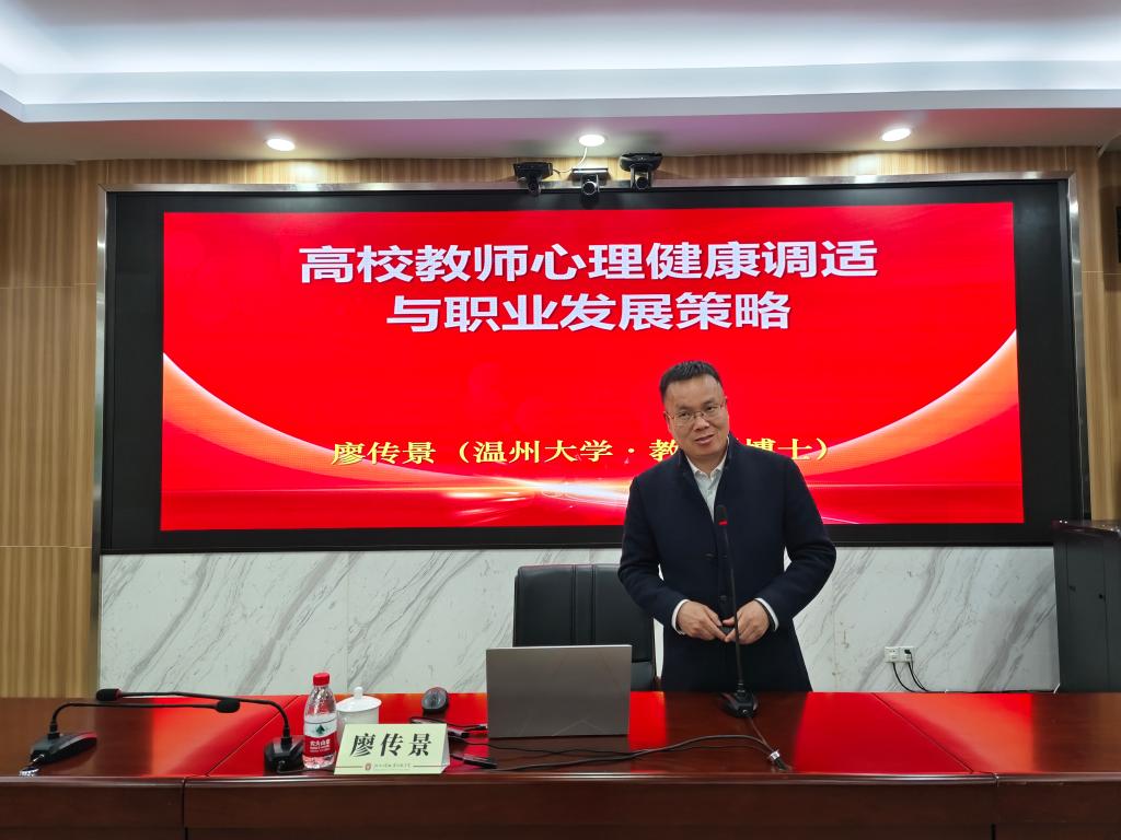 为扎实推进教师素质提升三年计划实施方案落地见效,切实守护教师身心健康,助力广大教职工有效缓解工作压力、提升心理调适能力,营造和谐向上的育人氛围,近日,教师发展中心成功举办教师心理健康专题培训讲座。本次讲座以“高校教师心理健康调适与职业发展策略”为主题,特邀温州大学教授、心理学博士廖传景担任主讲嘉宾,全校70余位教职工踊跃参训。