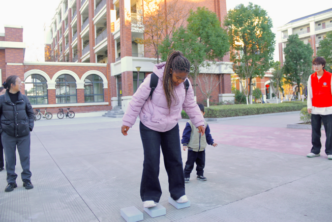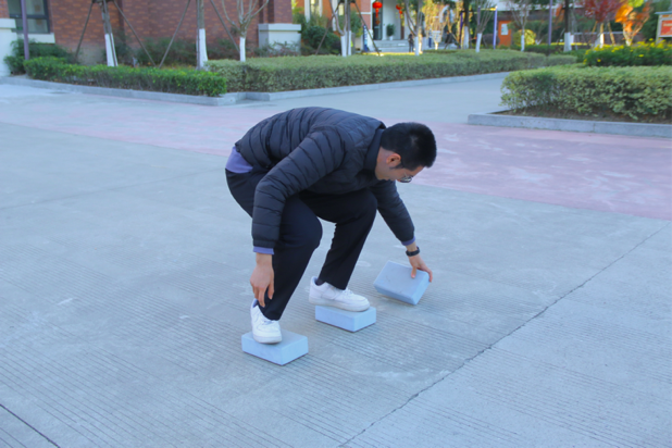 摸石过河游戏考验着选手的平衡感与专注力,脚踩泡沫石头,目光紧盯前方,步步稳扎稳打闯过十米赛道。同学们轮番上阵,在欢笑与挑战中收获勇气与友谊,沉浸式体验游园乐趣。