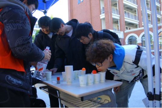 吹乒乓球过水杯的挑战热闹开启,同学们屏气凝神,对着杯口精准发力,看小球在水杯间跳跃前行。观战同学的加油喝彩声此起彼伏,大家的欢声笑语不断,彼此间的距离也悄然拉近。