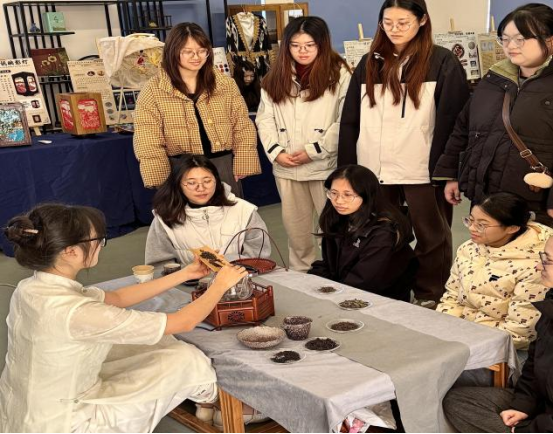 茶艺展示区以春夏秋冬为主题铺展茶席,素雅茶服与精致茶具相映成趣。学子们依循专业流程,流畅完成温杯、置茶、注水、出汤等一系列茶艺操作,动作规范优雅。茶汤入杯时茶香袅袅,瞬间弥漫整个展厅,尽显旅游服务专业的礼仪素养与实操能力。与之相对的围炉煮茶体验区暖意融融,参观者围坐炉边煮茶闲谈,沉浸式感受文旅融合的闲适氛围。