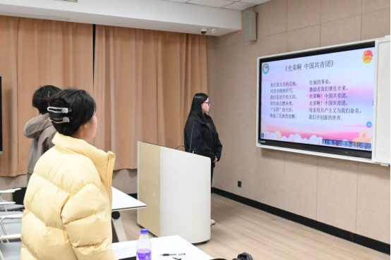 活动在嘹亮的团歌声中拉开序幕。团支书毛紫璇首先登台致辞,结合自身团学工作经历分享了心得体会,为本次主题团日奠定了昂扬向上的基调。师生齐聚一堂,围绕城市发展与青年就业的时代命题,展开了深入的交流与展望。