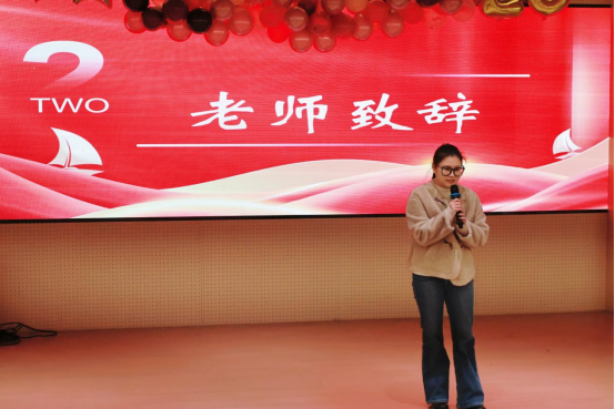 接着,周小倩老师上台致辞。她首先向全体学生送上元旦祝福,希望这场元旦晚会能成为同学们增进情谊的契机,并鼓励大家在接下来的表演中尽情展现自我,共同迎接崭新的开始。最后,她预祝晚会取得圆满成功。